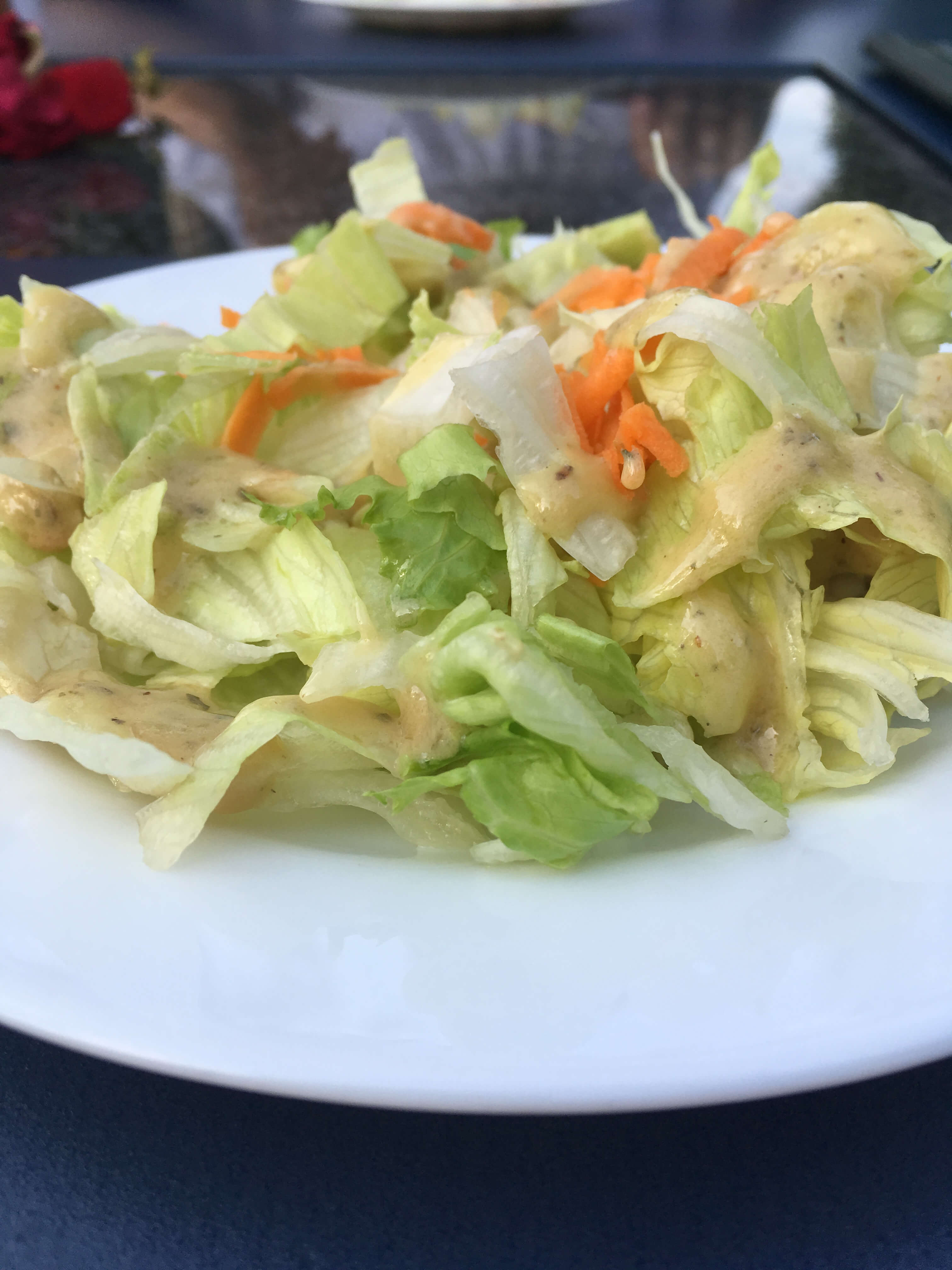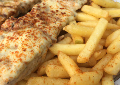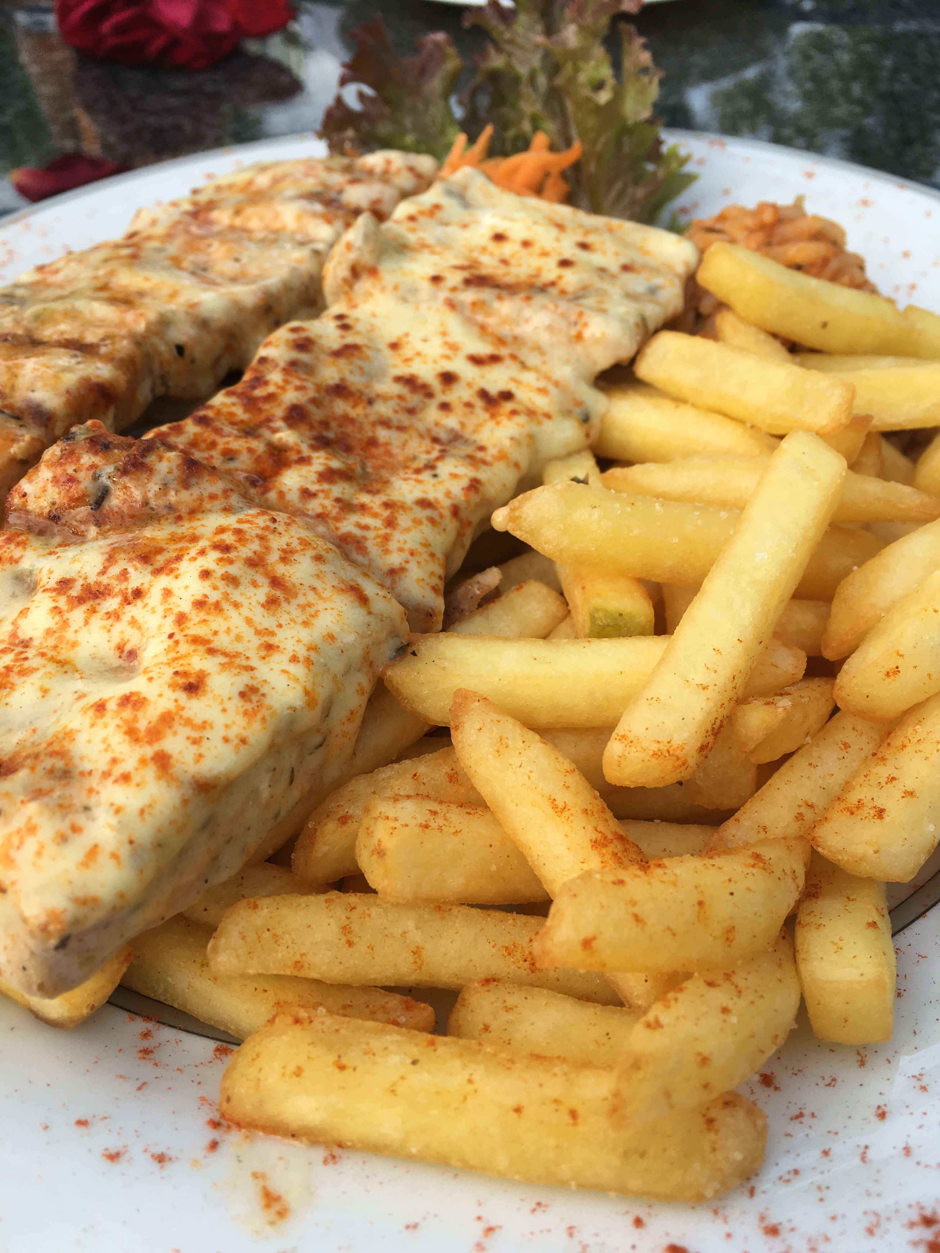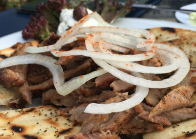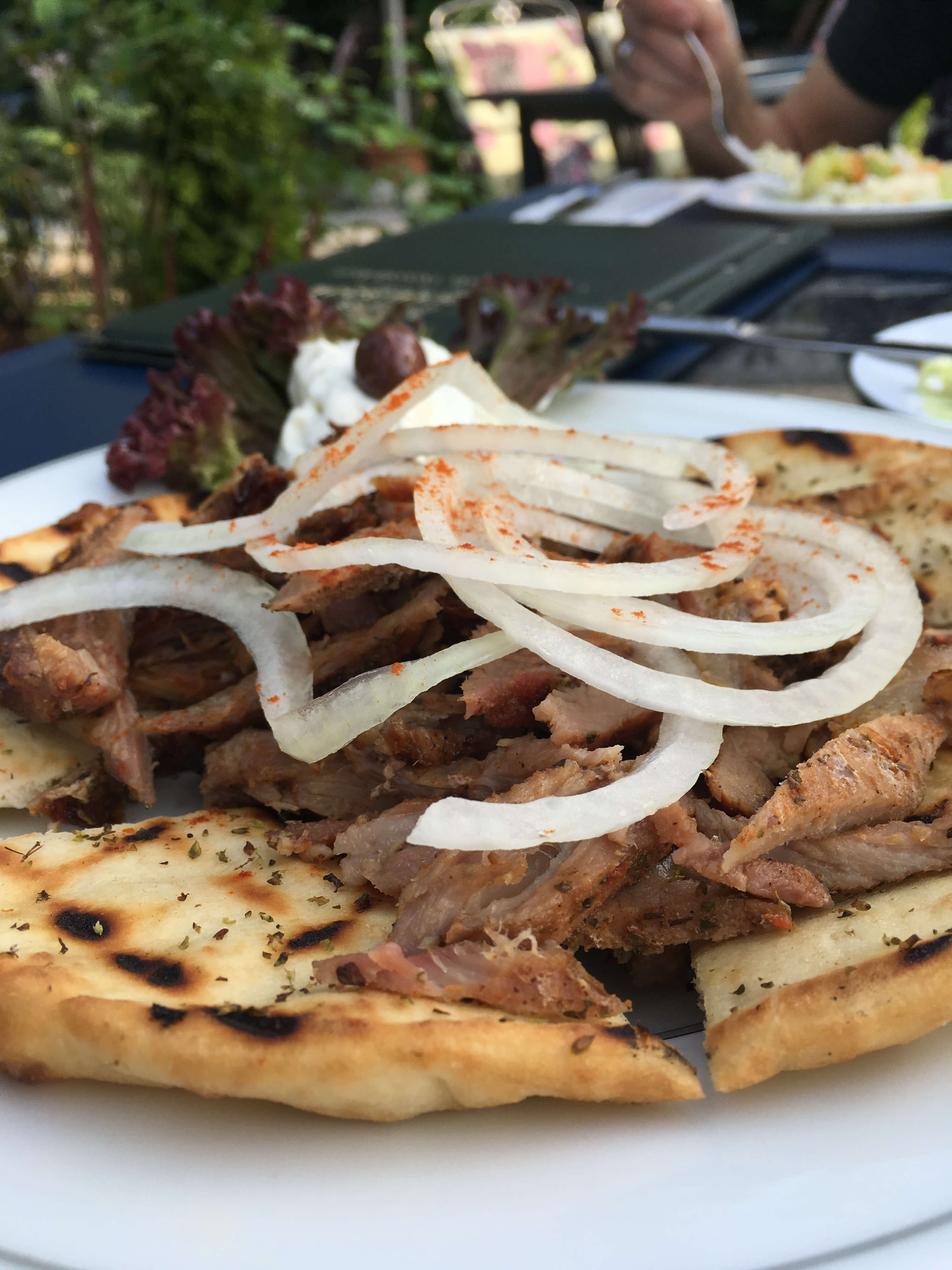 Als Hauptspeise gibt es bei mir immer Souvlaki und Gyros mit Pommes. Zu fast allen Gerichten bekommt man einen kleinen Beilagensalat bestehend aus Kraut-, Eisbergsalat und etwas Karotten. Die Souvlaki sind sehr gut gewürzt und die Pommes sind auch knusprig. Geschmacklich kann der Salat und die Hauptspeise voll überzeugen.